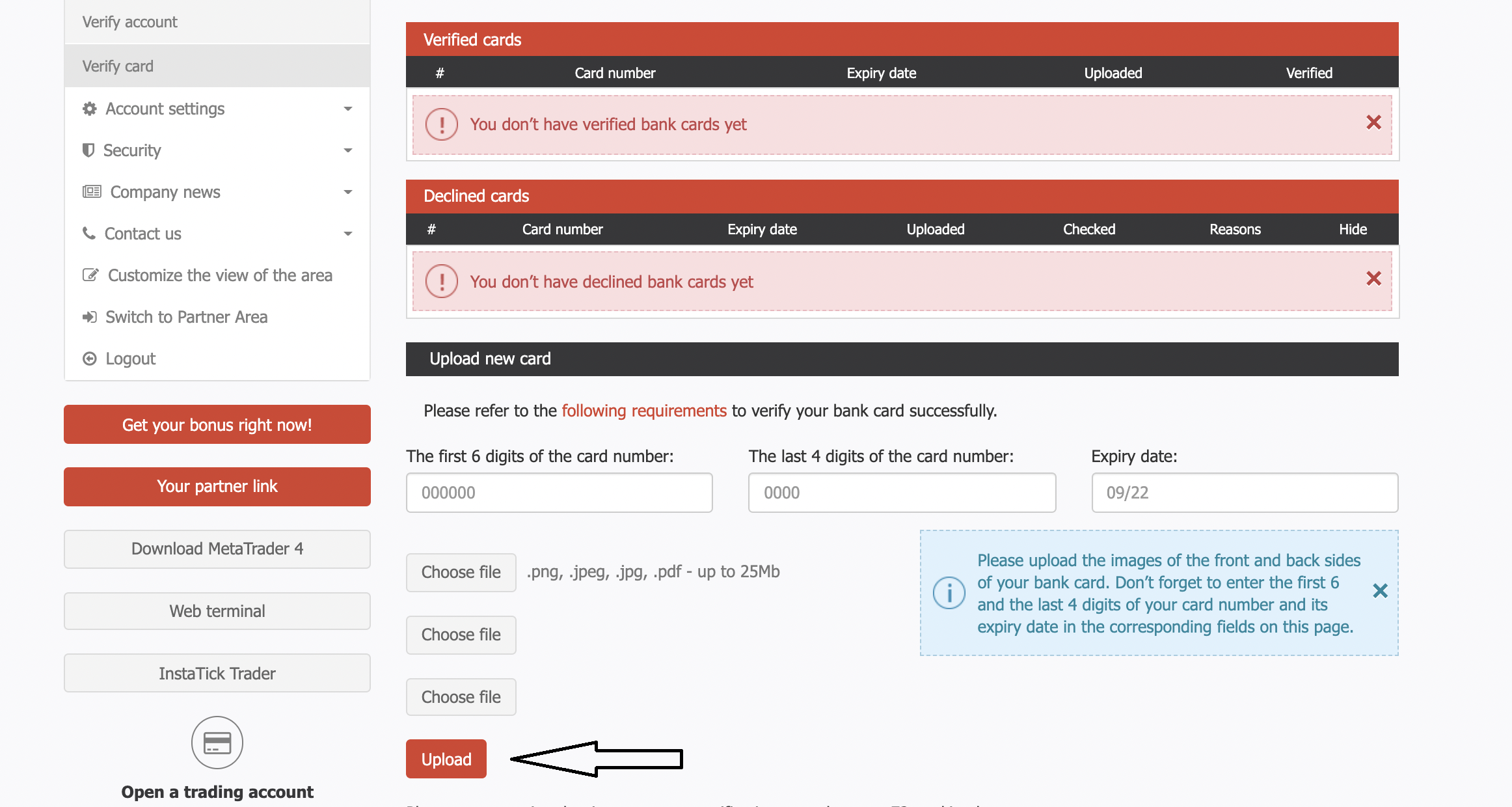 Please specify the first 6 and last 4 digits of the bank card number as well as the validity period in the Bank card verification section of the Client Area.